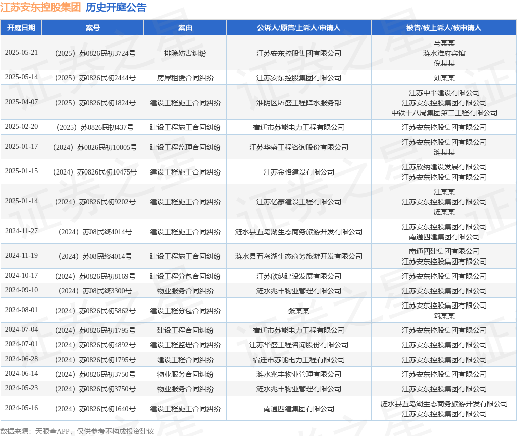 案号:(2025)苏0826民初2444号审理法院:涟水县人民法院案由:房屋租赁合同纠纷当事人信息: 原告/上诉人:江苏安东控股集团有限公司 被告/被上诉人:刘某某开庭日期:2025年5月14日根据统计,近一年内以江苏安东控股集团有限公司为当事人的历史开庭公告有18则,其中案由为“建设工程施工合同纠纷”的公告以7则居首,其次为“物业服务合同纠纷”有3则,“建设工程分包合同纠纷”有2则。历史开庭公告如下: